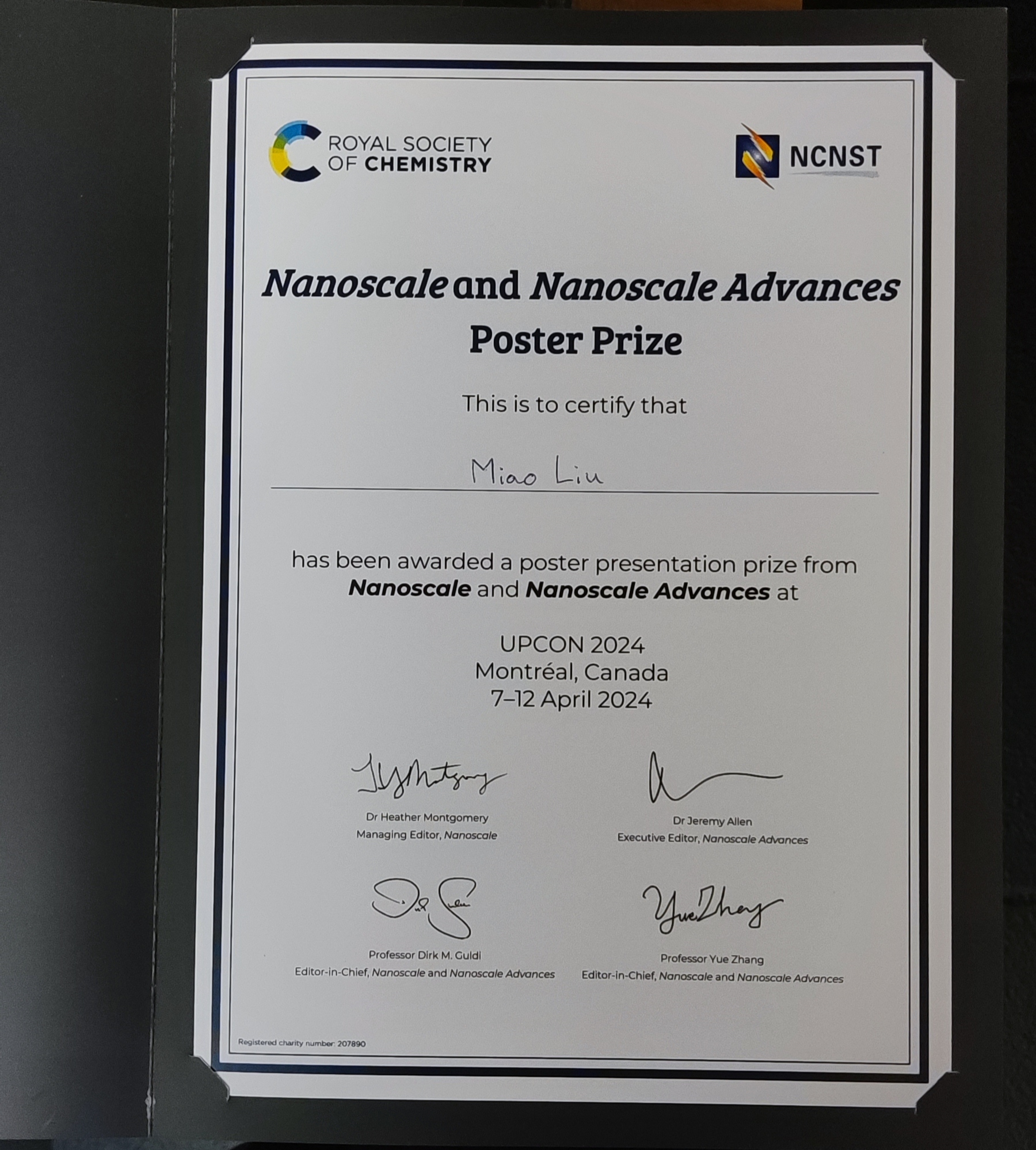 2024/04/15 – Miao Liu received the Nanoscale and Nanoscale Advances Poster Prize at the UPCON 2024 Conference. Congratulations.