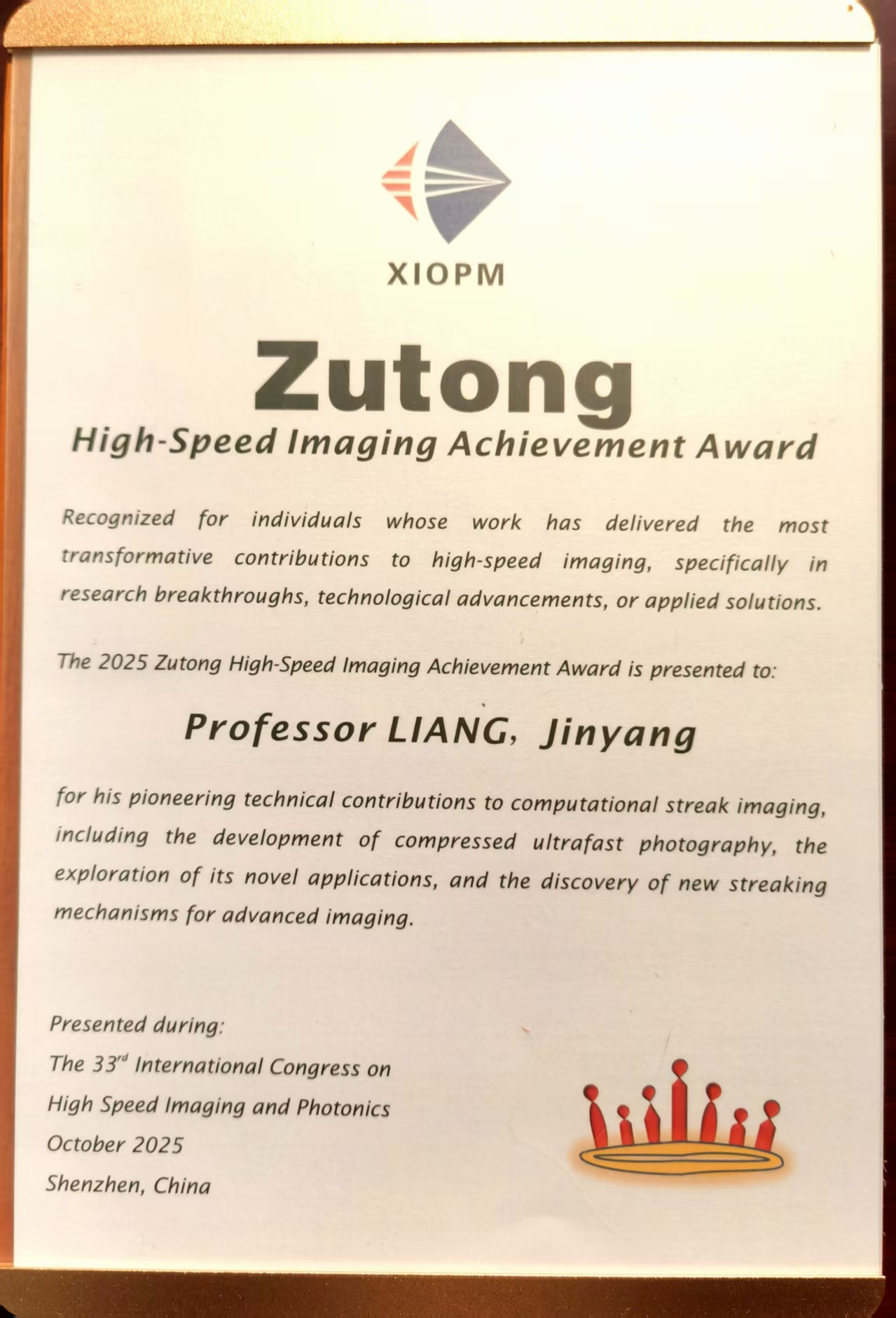 2025/10/17 – Jinyang Liang receives the 2025 Zutong High-Speed Imaging Achievement Award from the 33rd International Congress on High-Speed Imaging and Photonics. Congratulations.